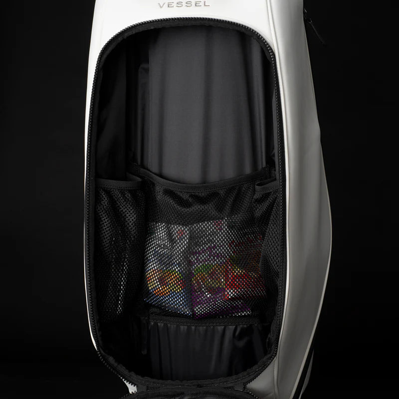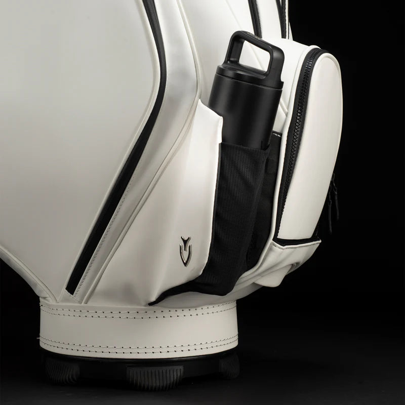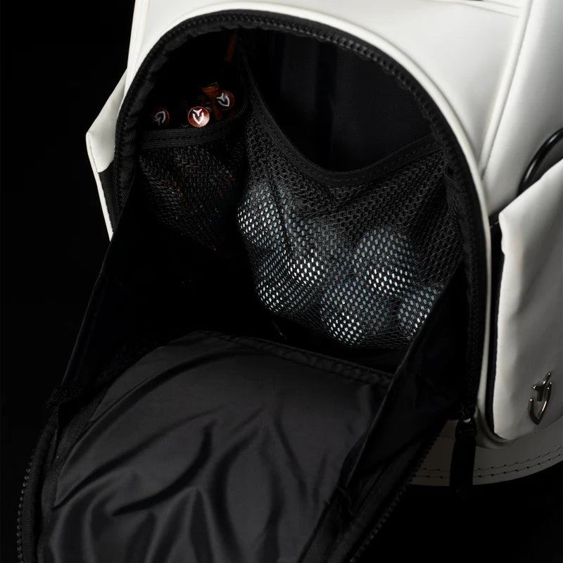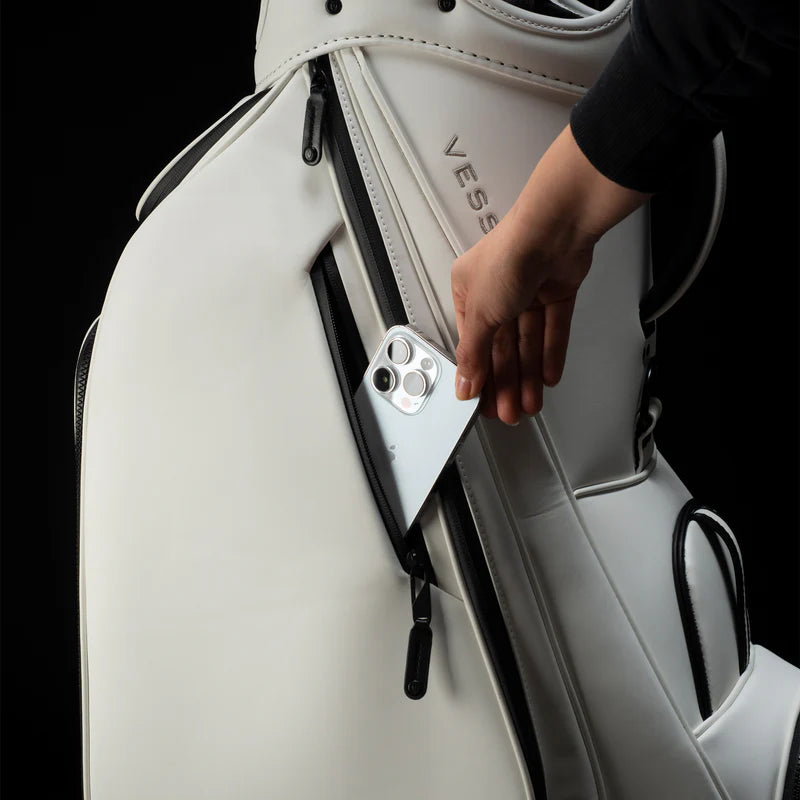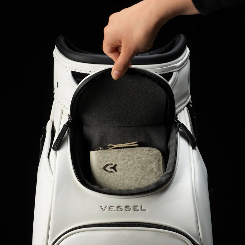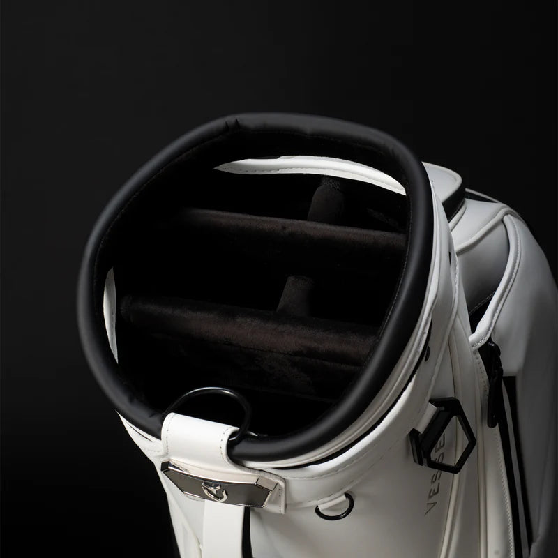Professional golf bags need to withstand the rigors of constant play and occasional travel so the VESSEL Prime Mini Staff bag features a 5-way top with structural steel ring. This meticulously-designed top is wrapped in luxurious microsuede and features 2 horizontal dividers to ensure that all golfing gear, clubs, and shafts are protected.
